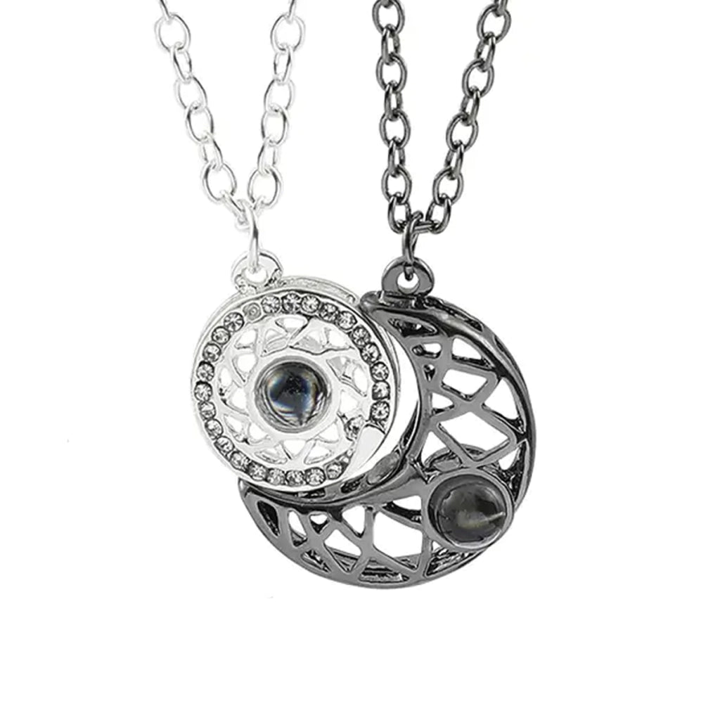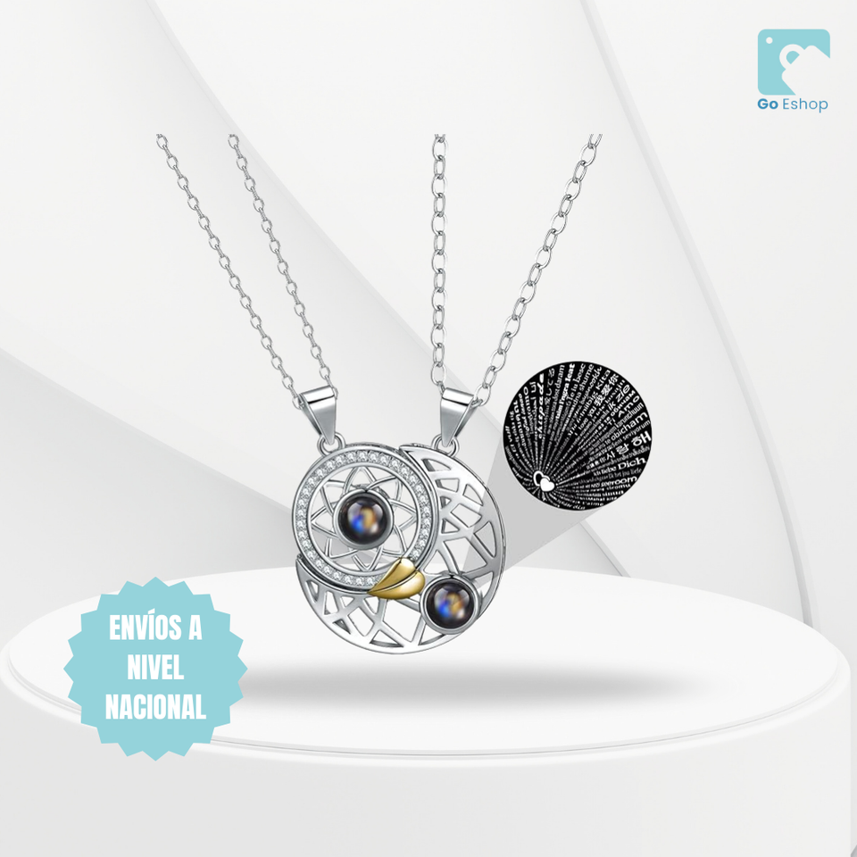 Este collar cuenta con un diseño exquisito de sol y luna, símbolos del equilibrio perfecto entre dos almas. Los imanes que lo acompañan son un recordatorio de cómo se atraen los corazones cuando están destinados a estar juntos. Y lo mejor: cada vez que tu ser querido lo mire, podrá ver la proyección de la palabra Te Amo en 100 idiomas diferentes, un mensaje que resuena sin barreras.